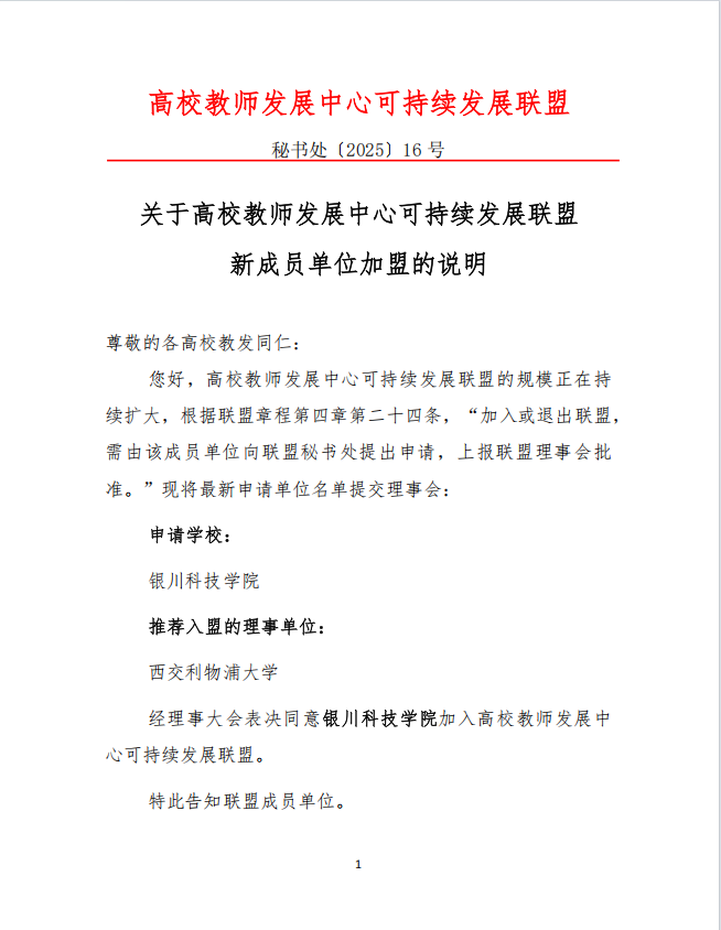 学校收到高校师发展中心可持续发展联盟秘书处《关于新成员单位加盟的说明》(【2025】16号文件),搭建国际化教师教学交流平台。