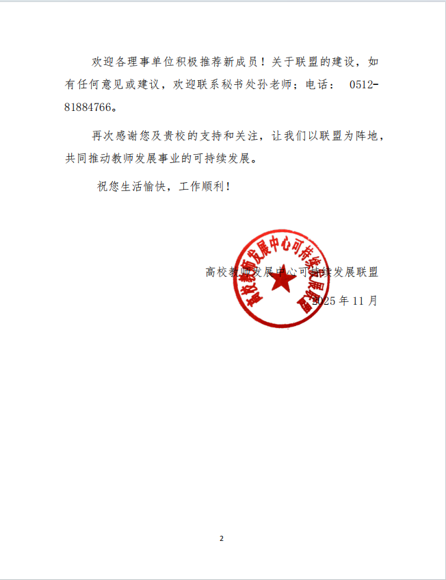 11月21日,学校收到高校师发展中心可持续发展联盟秘书处《关于新成员单位加盟的说明》(【2025】16号文件),该联盟致力于高等院校师资队伍建设需要,搭建国际化教师教学交流平台,深化教师教学能力培训体系,推动我国高校领域教师发展工作的改革与发展。